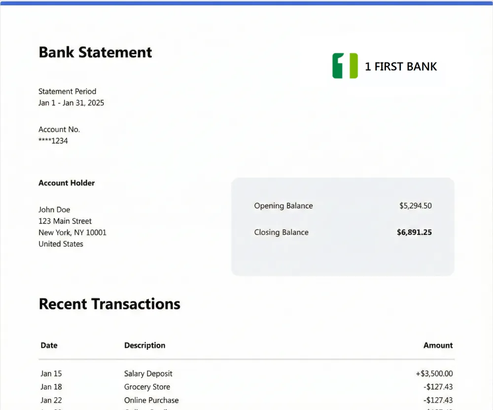 Our system reads every uploaded 1 FirstBank statement file, applies AI-driven extraction, structures the data as JSON, and completes the 1 FirstBank statement conversion online by exporting it to Excel or CSV. Files and extracted data are deleted from our systems after 90 days.