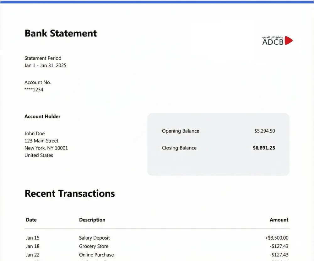 Smart Bank Statement Converter is a reliable Abu Dhabi Commercial Bank statement to Excel converter, transforming PDF files into clean, structured Excel or CSV outputs within seconds.
