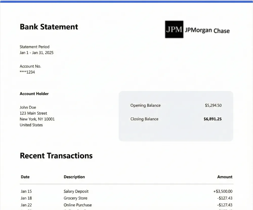 To extract JPMorgan Chase statements to Excel, upload your PDF file to Smart Bank Statement Converter. The system automatically reads the statement, extracts transaction data including dates, descriptions, and amounts, and converts it into a structured Excel (.xlsx) file.