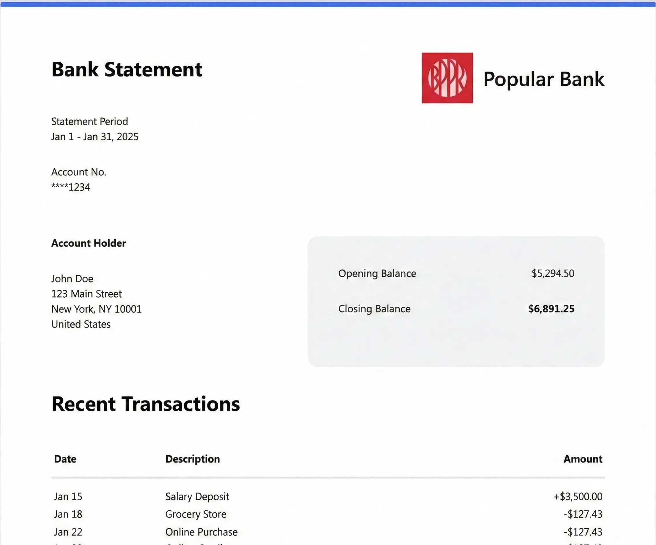 Popular Bank statements may include varying layouts, multi-page formats, or detailed transaction summaries. The converter automatically adapts and standardizes the data into a uniform structure that removes friction from analysis and helps ensure data remains clear and reliable
