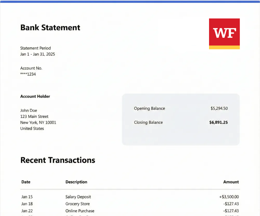 Wells Fargo typically provides statements in PDF format. After downloading the PDF from online banking, upload it to the converter to generate an Excel version suitable for analysis and reporting.